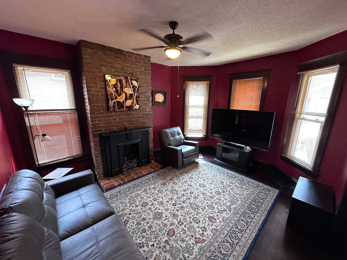 Amplio y acogedor, con suelos de madera en todas partes. Bellamente restaurado a su gloria original de 1920. Configurado para satisfacer tus necesidades. Espacios limpios y despejados, cocina completa, Wifi y lo básico para una estancia fácil. El tercer dormitorio ofrece espacio de oficina además de literas. Relájate en el porche delantero de este encantador barrio. A pocas manzanas de la oferta de cafeterías, restaurantes y entretenimiento de la calle principal. Parada de autobús MCT al otro lado de la calle para acceder fácilmente a SIUE y St. Louis.