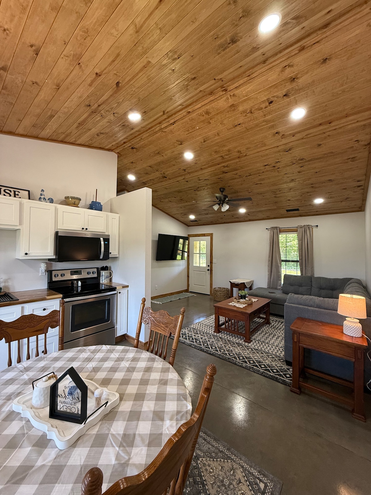 El espacio El encanto rústico se encuentra con la belleza serena de los Ozarks en este entorno mágico con vistas a nuestra granja, que ofrece un refugio perfecto para descansar o un campamento base para tu próxima aventura. En el interior, encontrarás un acogedor espacio habitable decorado con el encanto de una granja moderna, completo con una cálida chimenea eléctrica. Relájate en el cómodo dormitorio tamaño king después de un día de exploración. La casa también incluye un baño bien equipado y una cocina americana funcional para tu comodidad.