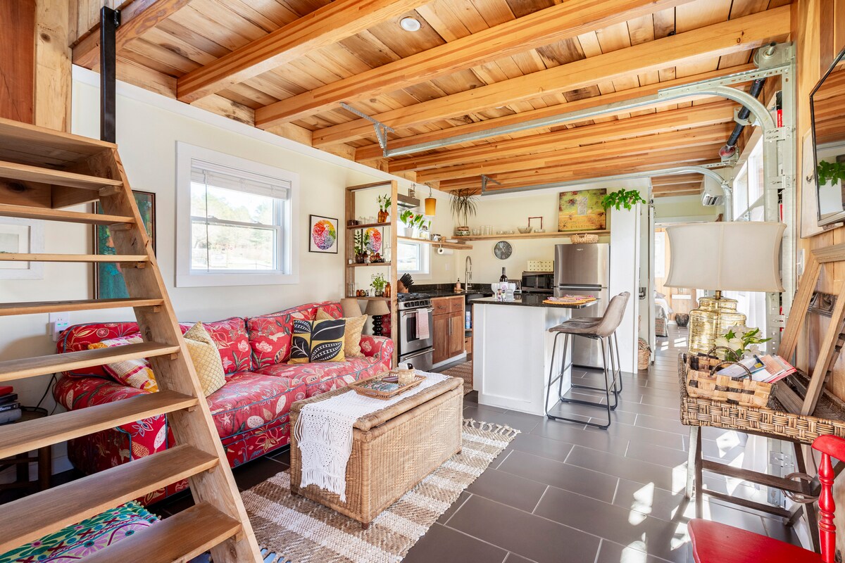 Sumérgete en la vida agrícola en una gran minicasa; a 15 minutos de Asheville. Traiga el exterior dentro y fuera con las puertas del garaje que se abren completamente al dormitorio principal y al área de la cocina. Sentado en un pasto de 2 acres con 2 pequeños arroyos que se encuentran en la esquina; con una puesta de sol que baja justo encima. Sal de la cubierta para alimentar a "alpacas y amigos". Recoge huevos frescos de granja y productos del jardín orgánico durante la temporada. Relájate en la hamaca o siéntate junto a la fogata; mientras asas tus comidas favoritas.