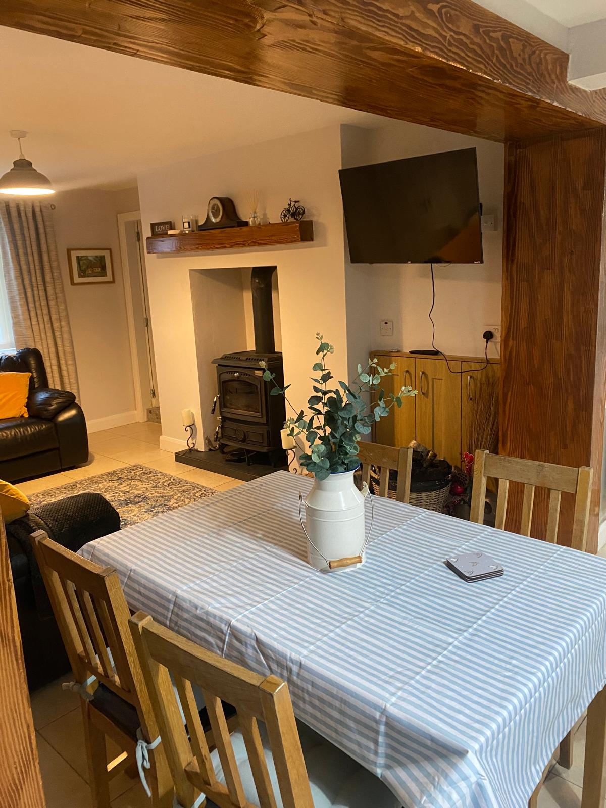 Acogedora cabaña tradicional irlandesa de dos dormitorios. Dormitorios a los que se accede desde la sala de estar con su cocina estilo granja. Dormitorio principal: vestidor y acogedora cama king. Dormitorio dos: 2 camas dobles, una habitación muy espaciosa y luminosa con 2 ventanas con vistas al jardín. La cocina es tradicional y tiene todas las comodidades y comedor para 6 personas. El baño está en la parte trasera de la cabaña y tiene una ducha eléctrica sobre la bañera. El jardín al aire libre y la plaza de estacionamiento están frente a la casa.