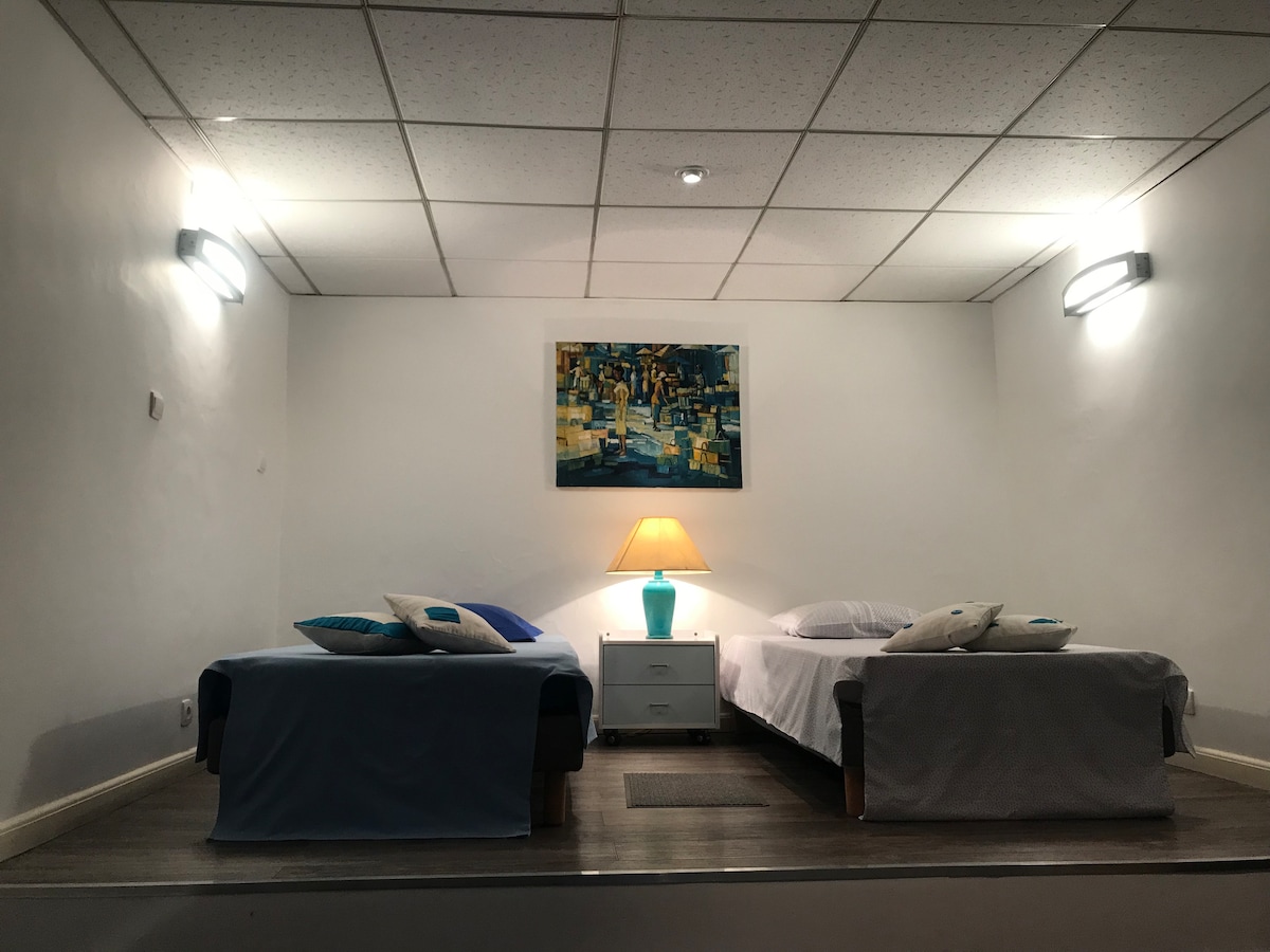 Perfectamente situado en uno de los pocos barrios residenciales del centro de la ciudad, el estudio independiente de una gran casa segura 7/7, tiene capacidad para 4 personas, en familia o con amigos. Contemplando la arquitectura de la ciudad desde su gran terraza, puede disfrutar de los pequeños platos preparados por usted mismo en su cocina americana. A pocos metros de restaurantes elegantes, bares y cafeterías de renombre, autoservicio, bancos, ministerios... puede sentirse independiente. ¡Un placer!