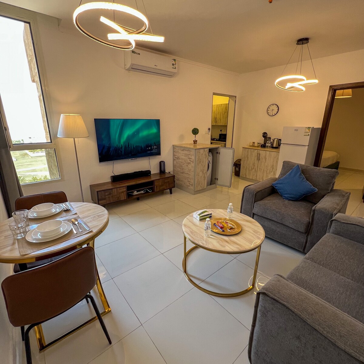 Una unidad elegante con un toque moderno y colores cálidos, con un dormitorio y salón con un ambiente cómodo y aire acondicionado silencioso. Incluye suscripción a IPTV, YouTube y Netflix. Ubicado en una ubicación animada cerca de todos los sitios y servicios de ocio, por lo que es ideal para un alojamiento cómodo y fácil de desplazarse. 📍 Ubicación: La ubicación del apartamento es ideal y está cerca de los lugares más importantes de la ciudad: • A 🛍️ 5 minutos del centro comercial Al Salam y del centro comercial Al Andalus. • 🏥 Cerca del Hospital East Jeddah y Sulaiman Al Habib • 🚆 Cerca de la estación de trenes Al-Haramain • A 🛫 15 minutos del aeropuerto. • A 🌊 15 minutos de la Corniche. • A 🏫 5 minutos de la Universidad Rey Abdulaziz.