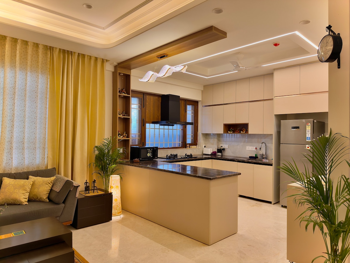¡Te damos la bienvenida a OnebyOne Sky Bungalow junto al emblemático hotel Taj Mahal, Lucknow, con un desayuno de cortesía! Un magnífico piso independiente, 1800 pies cuadrados, 2 enormes dormitorios cada uno con baños adjuntos ultralujosos con agua caliente, un vestíbulo, un comedor completo y una enorme cocina totalmente equipada con microondas, inducción, hervidor eléctrico, tostadora y un purificador de agua de alta tecnología. ¡El alojamiento está equipado con WiFi y TV de 55 pulgadas y alberga cómodamente a una familia completa de seis! ¡Un lugar increíble!