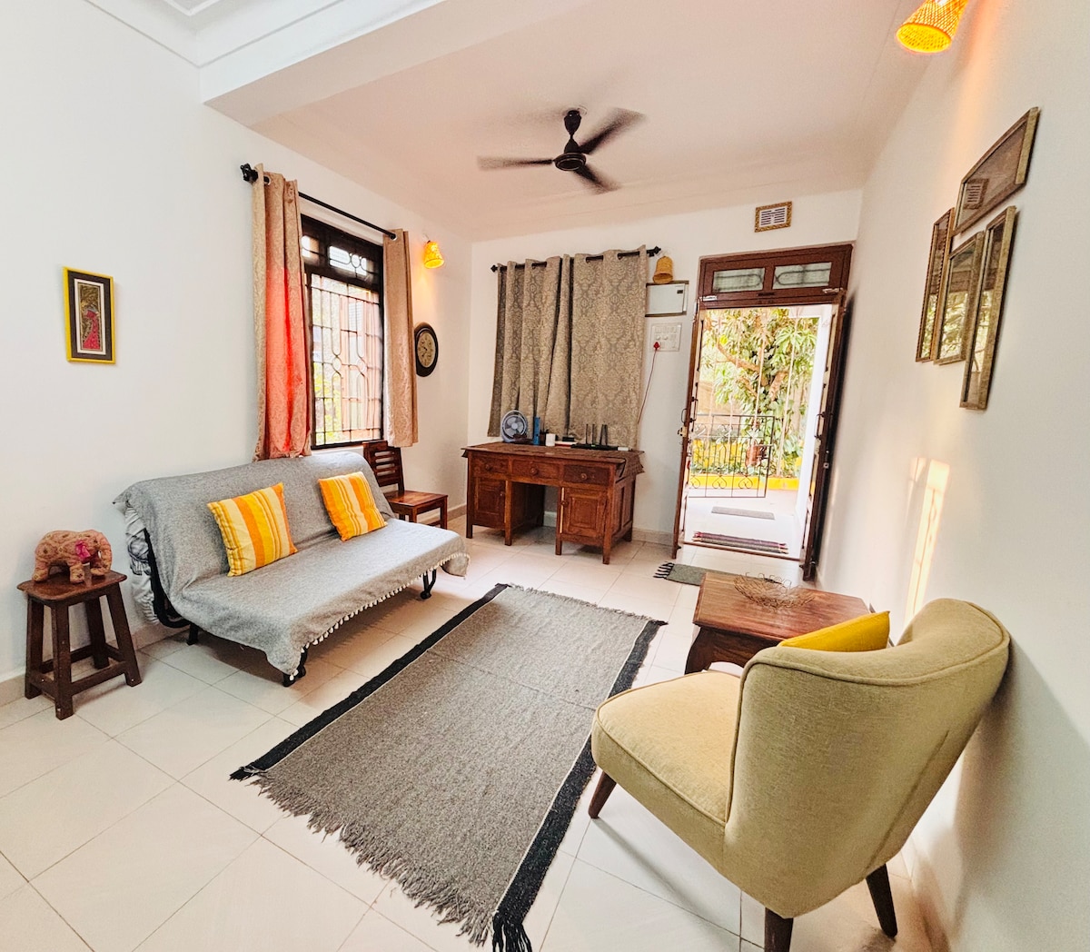 🌞La Casa YelloMello: donde el sol y la playa se encuentran con la serenidad. Este acogedor 1BHK apto para mascotas ofrece un dormitorio con aire acondicionado, una cómoda sala de estar, conexión Wi-Fi de alta velocidad con mini UPS de respaldo y una cocina totalmente equipada en Upper Mandrem Village, North Goa, a solo 3 km de la playa. Despiértate con el canto de los pájaros y el sol, lee nuestros libros📚, dirígete al mar 🏖️ para disfruta de los reflejos de la hora dorada, cocina 🍳o disfruta de conciertos en vivo y cafés. Para crear o simplemente hacer una pausa, te invitamos a relajarte a tu propio ritmo. No hay energía de respaldo para la casa.🏡