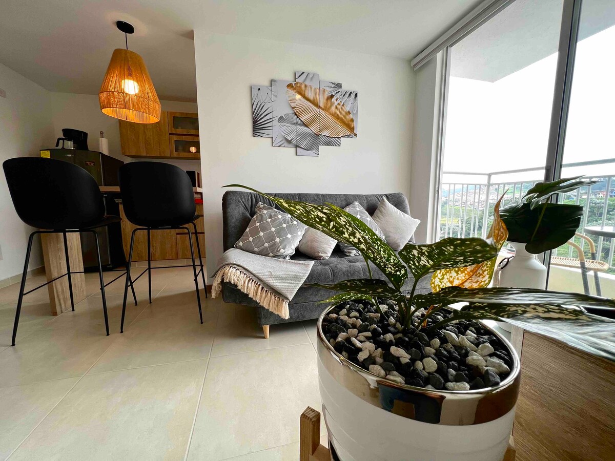 Hermoso y cómodo apartamento equipado totalmente, con espectacular vista a las montañas sector CERRO DE ORO. Está ubicado en una parte muy estratégica cerca a supermercados, eps, zona rosa, termales. No solo te ofrecemos un apartamento cómodo, totalmente equipado y de buen precio, sino respuestas rápidas y atención a todas sus preguntas y solicitudes que puedas tener en tu estancia. Estoy disponible las 24 horas del día. El Espacio Dormitorio principal : Cuenta con una cama Queen