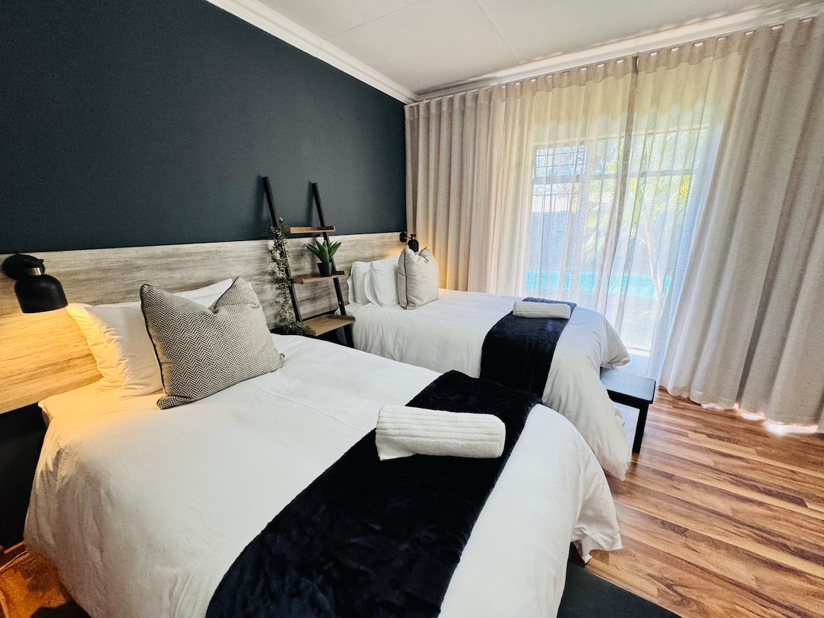 Apartamento recientemente renovado con entrada privada, techo bajo techo gratuito y estacionamiento pavimentado. Solar recientemente instalada. Agua de pozo. Apto para niños y mascotas. Zona braai privada. Dos plazas de trabajo. Conexiones USB en enchufes de pared. Wifi gratuito. TV con Netflix. Secador de pelo y plancha. Cama tamaño queen. Cocina privada con freidora de aire, microondas, tostador, hervidor de agua y émbolo, vajilla y cubiertos. Baño excepcionalmente espacioso con bañera, ducha, bañeras gemelas, bidé y asientos exteriores.