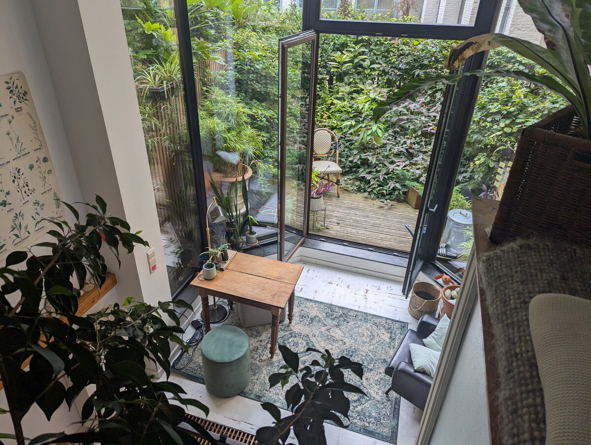Situado en una pequeña plaza pintoresca, a poca distancia a pie entre la Grand-Place y el Sablon, este auténtico apartamento de artista de Bruselas te encantará al instante con sus techos altos y su amplia terraza con barbacoa. Además de todos los servicios básicos como wifi y una máquina de café expreso, encontrarás un proyector que proyecta una imagen de 2 por 4,5 m para disfrutar de tu serie favorita o una película. Hay muchas plantas, también un enorme escritorio de vidrio que puede servir fácilmente como espacio de trabajo para hasta 2 personas.
