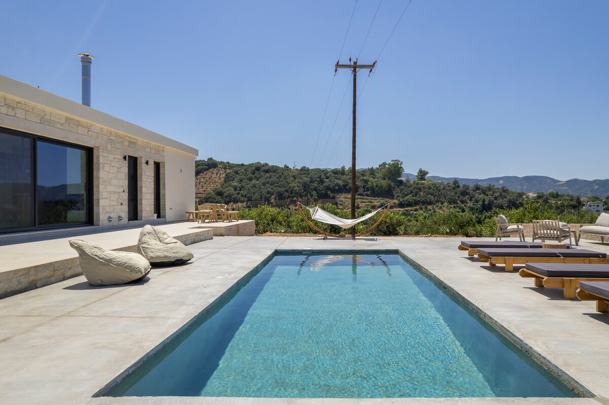 Spacious yet cozy, our 2-bedroom Villa is ideal for families with kids or individual travelers who seek privacy in a Cretan summer setting. Royal sleep on dreamy mattresses and large terrace with panoramic view, BBQ, hammock, sunbeds, dining table. Located on a top of a hill overseeing Agia Marina, it retains a tranquil, relaxing vibe. A drive away from supermarkets, restaurants, beaches and water sport centers, it meets everyone's expectations. FREE parking, and cleaning service on long stays!