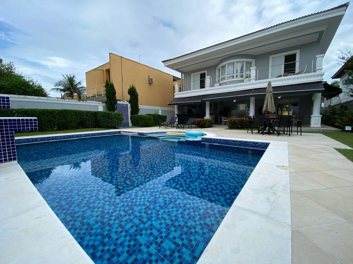 Acogedora casa con piscina, barbacoa, horno de leña y chimenea. Situada en el mejor condominio de Guarujá. La casa está amueblada y con todos los utensilios domésticos. Aire acondicionado en todas las habitaciones. Todas las habitaciones son suites y tienen ropa de cama y toallas. La casa se encuentra cerca de la playa, el mercado y los bares. Conserjería y seguridad las 24 horas.