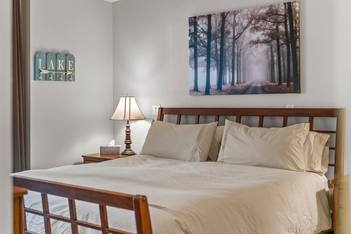 **Propiedad privada frente al lago **Bañera de hidromasaje de agua salada. **Impresionantes vistas **Ambiente relajante con chimenea de gas. **¡3 dormitorios y 2 baños! ** Amplio salón. ** Fogata con leña de cortesía cuando se permiten fogatas. **Lavadora/secadora ** Kayaks, paddleboard, canoa y pedalboard gratuitos en verano. ** A poca distancia a pie de restaurantes de temporada en el puerto deportivo, tiendas de comestibles, delicatessen y licorería.
