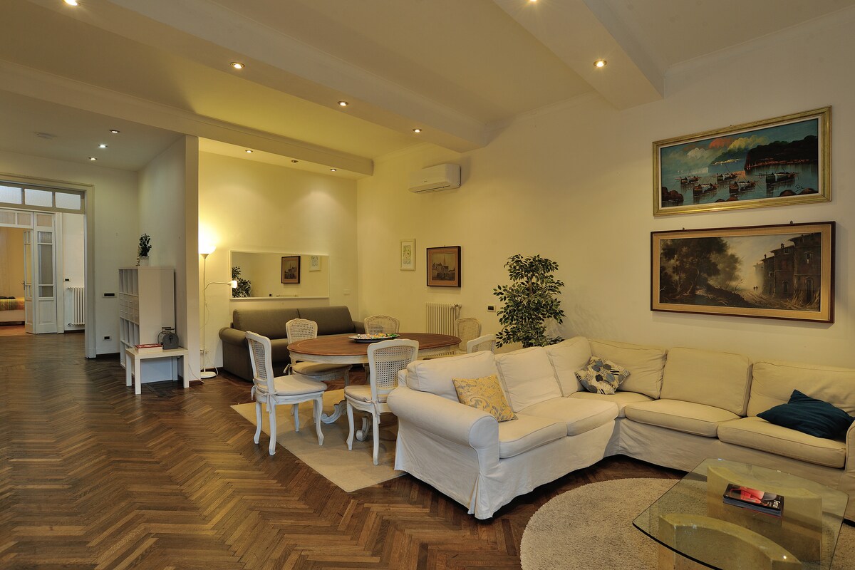 L'appartamento si trova al piano primo di un prestigioso condominio di Modena, a due passi dal centro storico, 5 minuti a piedi al teatro Storchi. L'appartamento (120mq) include 2 grandi camere da letto (con due letti ciascuna), due bagni indipendenti, una cucina abitabile, sala da pranzo e un grande soggiorno. Compreso di finestre vista parco con balcone al patio interno. Permettiamo anche di utilizzare il garage interno, che si trova nel sottosuolo del edificio, per una macchina mediana.