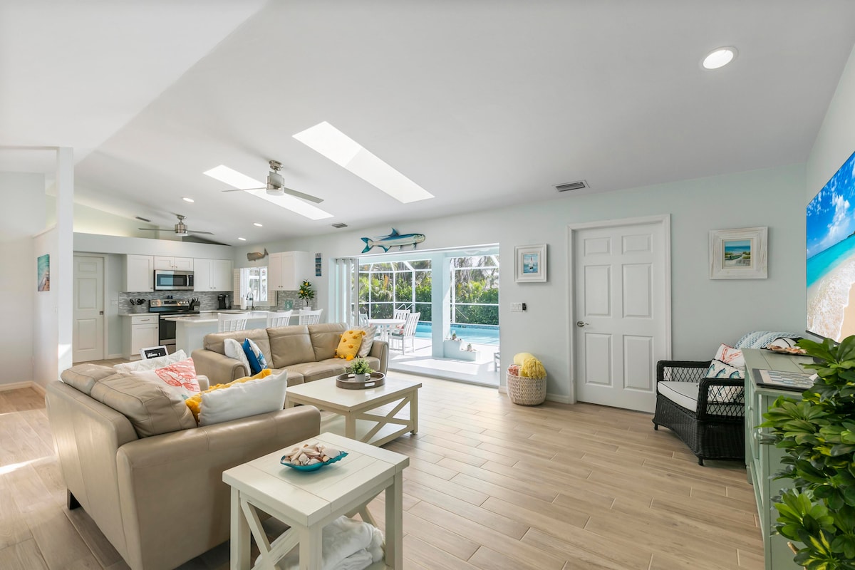 Hermosa casa de playa renovada a poca distancia a pie o en bicicleta de todo lo que necesitas para disfrutar del hermoso clima de Marco Island. Mobiliario nuevo y de diseño decorado en estilo playero chic. 3 camas, 2,5 baños. Excelente ubicación a 7/10 millas de la playa de Tigertail. A 3 minutos en bicicleta o a pocos pasos de la playa. Hermosa piscina grande y lanai protegido para comer al aire libre. A poca distancia a pie de muchos restaurantes. Todo lo que necesitas para divertirte bajo el sol: bicicletas, sombrilla, nevera y toallas de playa. ¡Disfruta del paraíso en tu propia casa con piscina!