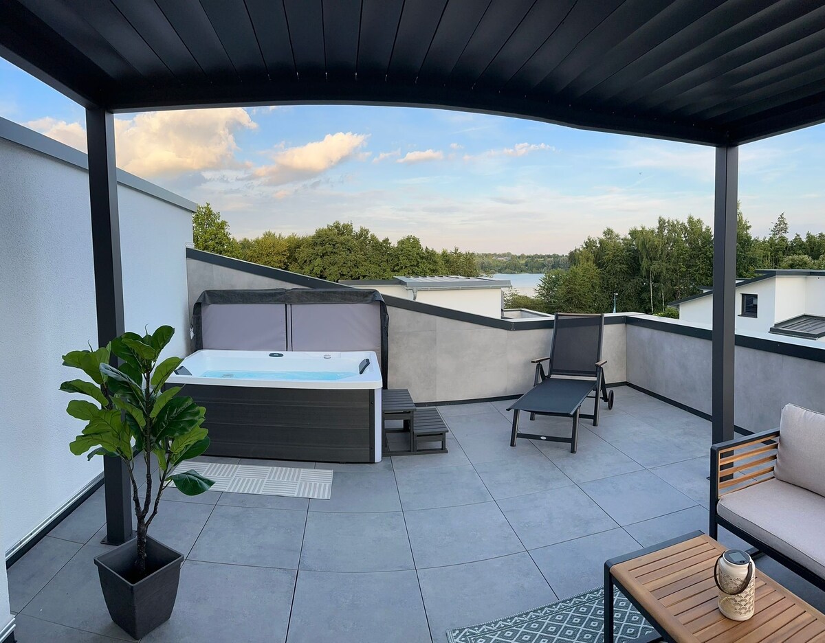 ¡Te damos la bienvenida a Immo-Vision y a esta casa de ensueño de bienestar en el Aggertalsperre! Este ático combina lujo, comodidad y naturaleza: • Vista panorámica • Oasis de bienestar con sauna y bañera. • Artículos modernos • Terraza con jacuzzi, barbacoa y asientos. • TV inteligente • 2 dormitorios con acogedoras 1,80 camas dobles. • Sofá cama con gran área para dormir. • Cocina totalmente equipada con cafeteras totalmente automáticas. • Acceso directo a rutas de senderismo y experiencias en la naturaleza • Ascensor al ático