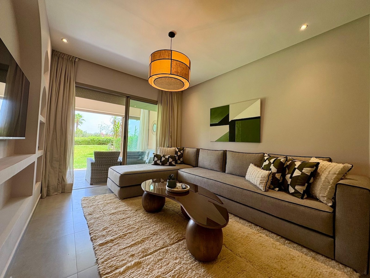 Despiértate con vistas abiertas al campo de golf en un apartamento luminoso y moderno de 2 dormitorios dentro de una residencia tranquila y segura. Terraza privada soleada, 2 piscinas y fácil acceso a las principales áreas de Marrakech, perfectas para familias, parejas o estancias de trabajo remoto. - Terraza privada con vista al campo de golf. - Acceso a 2 piscinas. - Interior moderno y luminoso - Wifi rápido + TV inteligente - Cocina totalmente equipada. - Aire acondicionado o calefacción - Check-in autónomo. - Aparcamiento gratuito - A 5 minutos del aeropuerto / 10 minutos de Gueliz y Medina.