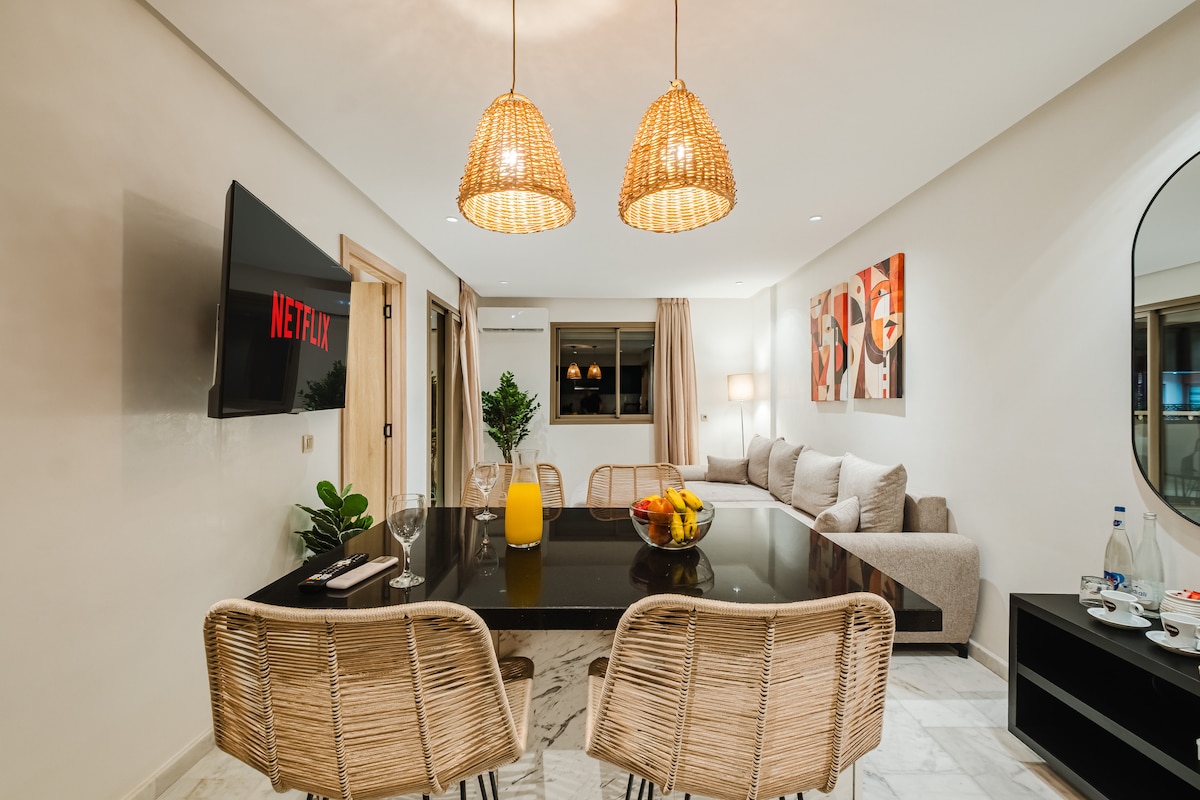 Un nido contemporáneo, que combina el diseño moderno y el encanto marroquí Sus nichos de pared esculpidos y retroiluminados, su mobiliario y su cálido salón crean un ambiente elegante y relajante Los detalles reflejan el espíritu bohemio chic de Marrakech Cada detalle ha sido elegido para ofrecer una experiencia única, ya sea que venga a relajarse, trabajar o explorar la ciudad Por la noche, los juegos de luz suave transforman el lugar en un remanso de paz en el corazón de la efervescencia urbana.