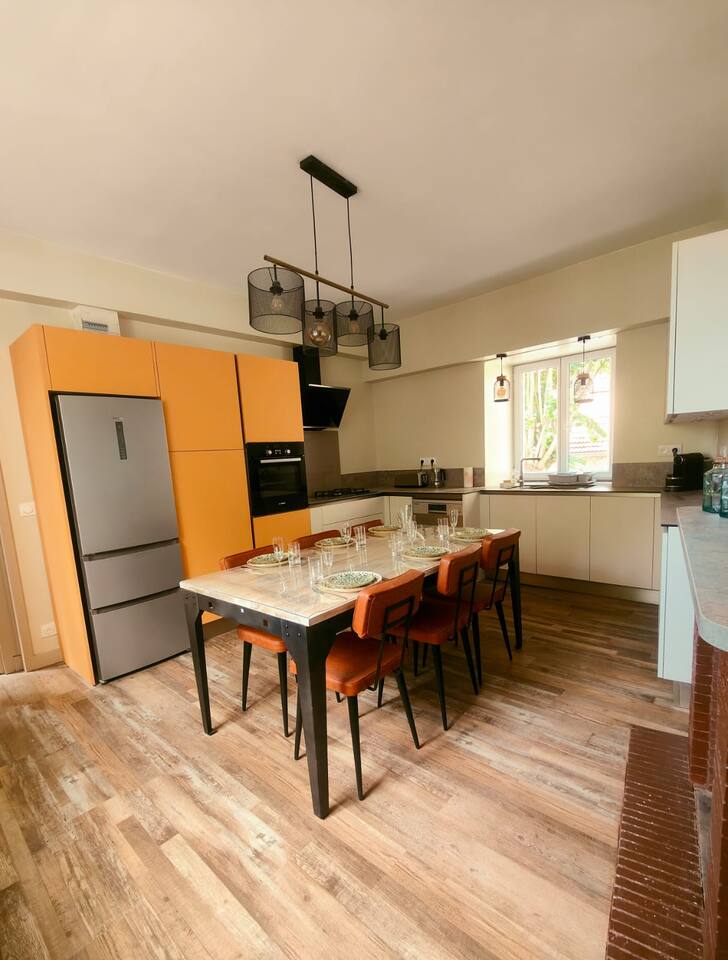 Casa de pueblo con vistas a un patio privado con plancha, para 9 adultos, que combina lo antiguo y lo moderno para una agradable estancia familiar. A dos pasos de todas las comodidades, se compone de: En la planta baja: cocina equipada abierta a la sala de estar y su pequeña sala de estar, lavadero, aseo. Arriba: 4 dormitorios, 2 baños, incluido un dormitorio con baño independiente. Nuestro favorito es la bodega abovedada, que alberga un futbolín. Hasta pronto en nuestra casa