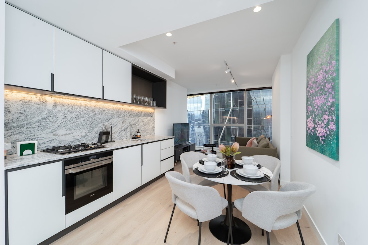 Mismo edificio con Hotel Ritz Carlton de 6 ESTRELLAS. El LUGAR DEL LADO OESTE de nueva construcción tiene todo lo necesario para una lujosa escapada a Melbourne. El apartamento con hermosas vistas al jardín y a la ciudad, donde puedes tomar las fotos más hermosas para compartir con tus amigos. Podrías usar 2 piscinas , salas de sauna y gimnasio libremente. Hasta 6 huéspedes, que ofrecen 1 grande dormitorio y 1 baño. Este lugar está diseñado y amueblado de nuevo, tu estancia aquí está garantizada para que te sientas renovado y rejuvenecido.
