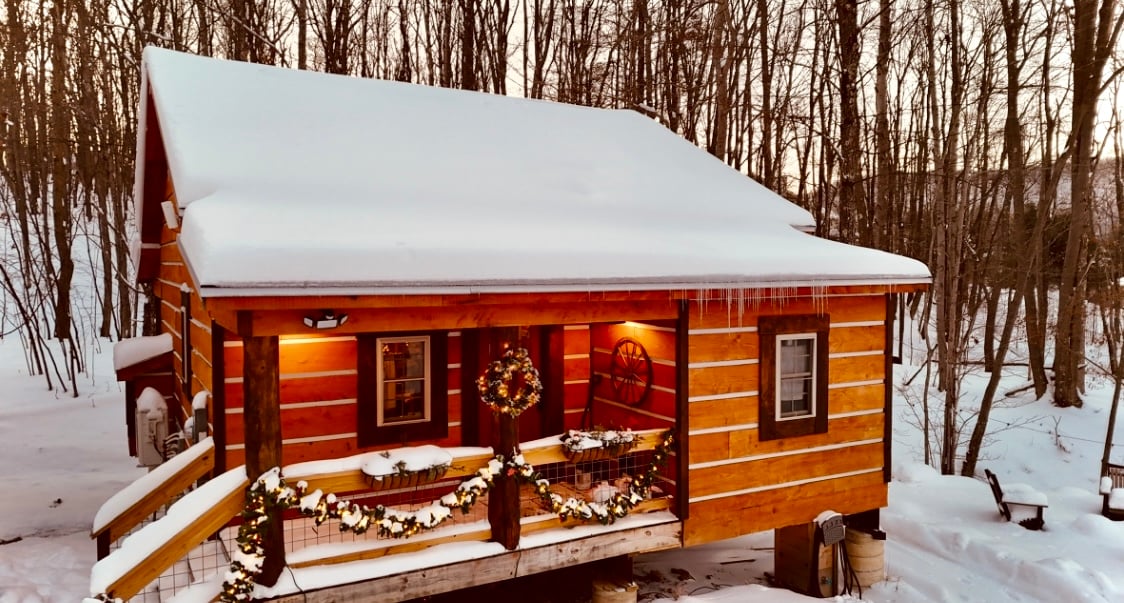 This is a 1,000 sq foot open concept rustic cabin. There are 4 "rooms" including a fully equipped kitchen, a dining room, a family room with a TV for movies and streaming, and a bedroom full of windows. It is located down a 1/3 mile gravel driveway in the woods on 72 acres of land that has been dedicated in perpetuity to not being developed.