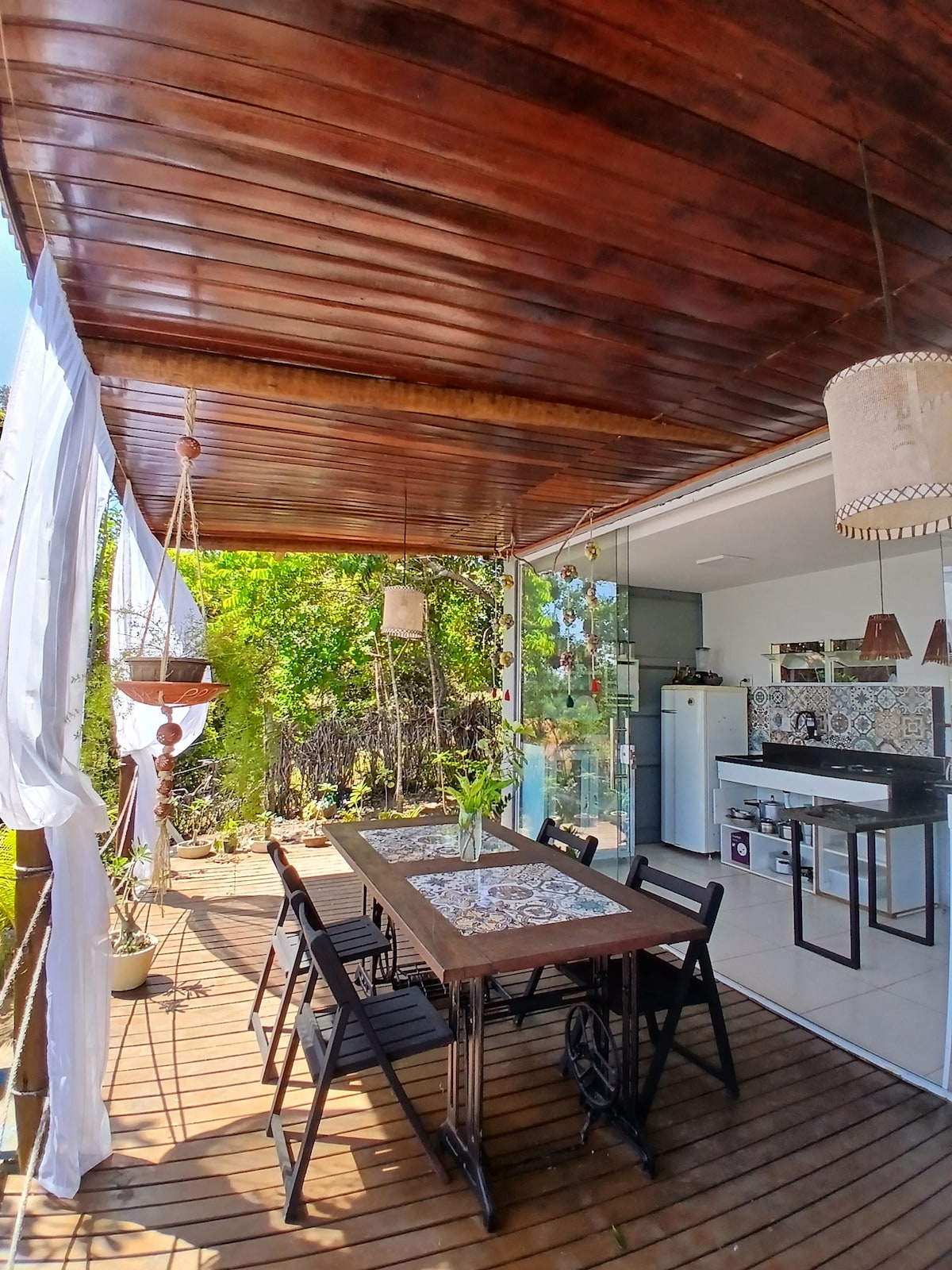 Decoración rústica y cómoda. La casa tiene piscina, está bien ventilada y es bucólica. Tiene aire acondicionado en el dormitorio principal, hamacas en los balcones y en la sala de estar, un césped, una ducha en el jardín, una parrilla para barbacoa y la propiedad está completamente vallada, por lo que puedes traer a tu mascota. Es una ubicación privilegiada debido al silencio y la tranquilidad... para aquellos que buscan paz, tranquilidad y aprecio por la naturaleza. La casa está en una esquina y se encuentra en el pueblo, en la mejor zona de Massarandupió, donde se encuentran las tiendas de comestibles, restaurantes y panadería.
