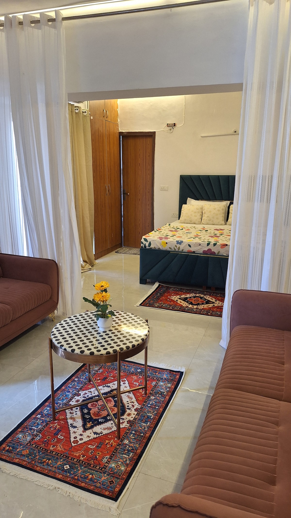 El primer apartamento de 2 Bhk que cumple con todos los requisitos ✨ - 2 dormitorios ( dormitorio principal, segundo dormitorio). - Dos camas tamaño king. - Una amplia sala de estar con una cómoda disposición de asientos. - 2 baños ( 1 en cada uno de los dormitorios). - Cocina pequeña (con todos los utensilios básicos de cocina disponibles y servicios abastecidos, es el lugar perfecto para preparar tus comidas favoritas) - Una zona de balcón compartido que conecta con el apartamento, que puede ser el espacio perfecto para tus paseos nocturnos. ¡Reserva ahora!