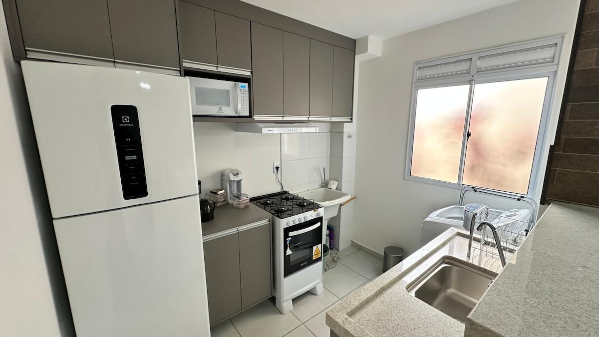 Alójese cerca de Shopping Jaraguá, Havan y Fatec en Araraquara. Región hermosa y segura. AP NUEVO, en condominio cerrado, en la planta baja, con WIFI y NETFLIX, puerta principal con cerradura electrónica (auto check-in), primer dormitorio con cama queen, AIRE ACONDICIONADO y ARMARIO amplio, segundo dormitorio con cama queen y sin aire acondicionado, sala con TV, cocina equipada con todos los electrodomésticos nuevos, lavandería, baño social y 1 plaza de garaje.