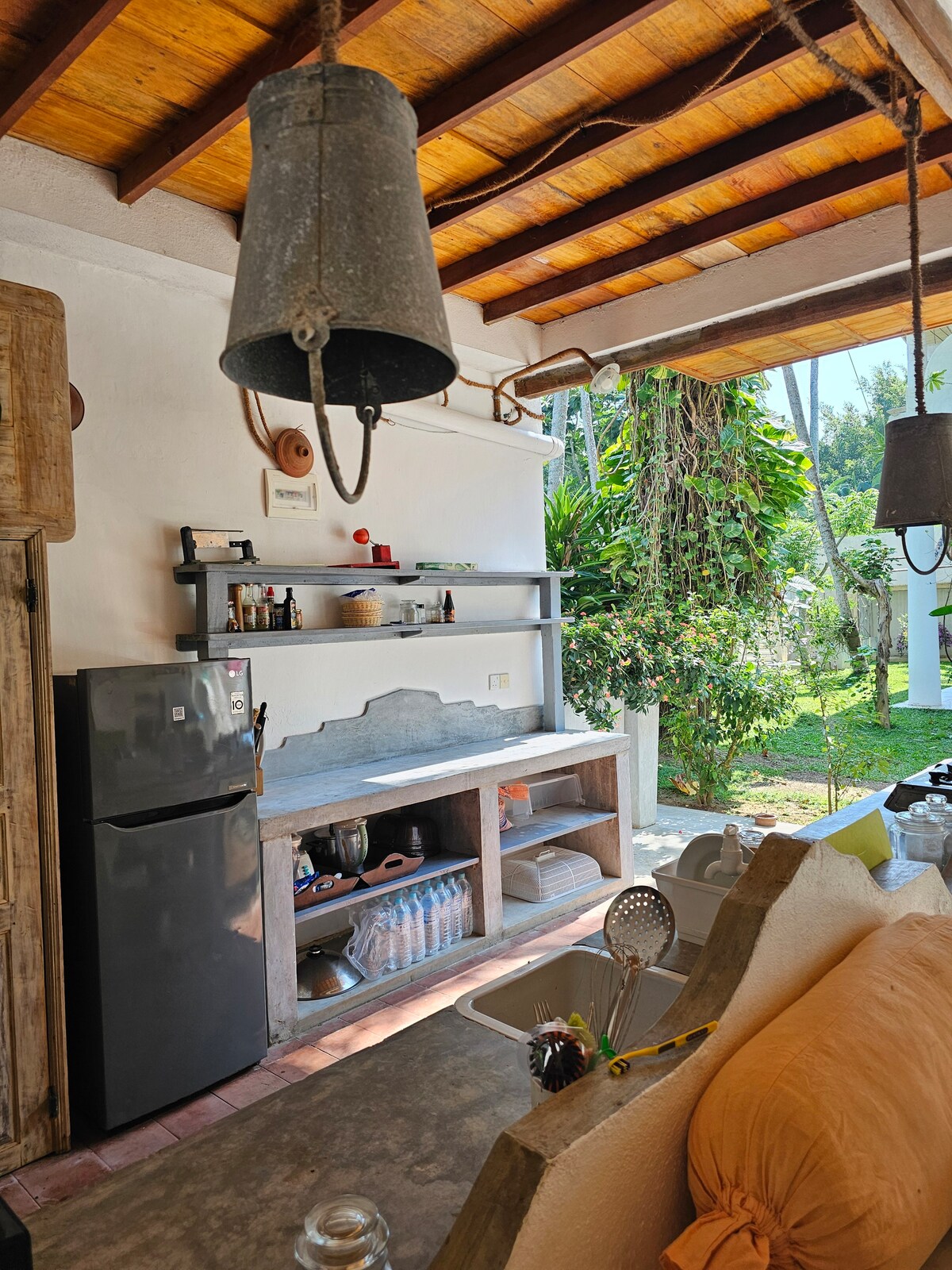 Una casa de playa independiente de propiedad europea en una bahía aislada en Thalaramba, a pocos minutos de la animada Mirissa y que ofrece un alojamiento elegante. Perfecto para una pareja en el dormitorio principal y el segundo dormitorio recién renovado. tiene dos camas individuales para 2 niños o 2 adultos individuales. Decorada con buen gusto en estilo colonial de Sri Lanka con sala de estar separada y cocina bien equipada. Conexión wifi de fibra con 100 mbps para aquellos que trabajan como nómadas digitales. NO hay aire acondicionado, pero hay ventiladores.