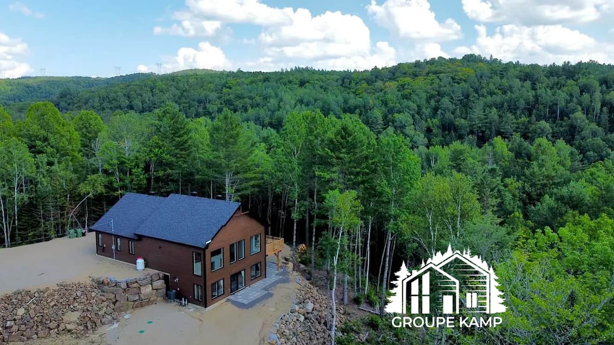 Our Nordic forest chalet is perfect for spending quality time as a couple (or with a kid), or for a work-retreat (with high-speed WiFi). The wooden interior is warm and cozy. The full-height windows offer stunning views over a forested valley. The open-concept kitchen and living room keep you in the conversation while cooking. If you prefer to cook outside, there is a fire pit with a grill and outdoor dining table. Only 70-min drive from Montreal. The lake is a 25-min walk if you park nearby.