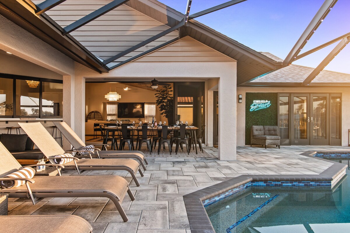 -All you need private retreat, 1 mile to downtown Cape Coral, 20 min to downtown Fort Myers & 25 min to Sanibel -Canalfront with heated pool & infinity-edge spa -Steam shower & spa-style toilets for a touch of pampering -Putting green & kayaks for outdoor family fun -Jet ski lift & 55’ boat dock—bring your water toys! -4 bikes for exploring the neighborhood -Garage gym -Tiki hut & outdoor lounge for family hangouts -Game room with pool table, shuffleboard, piano & karaoke—endless entertainment