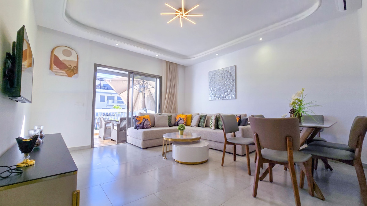 Profitez d’un superbe appartement avec vue sur piscine et sur lac. WIFI fibre optique. Smart TV. Récemment meublé. Prestations de standing. Guide pour activités et restaurants. Résidence avec 2 piscines. Comfort contemporain. Près de toutes les commodités. Max 4 personnes. Il dispose de deux chambres doubles, 2 canapés, une cuisine très bien équipée et deux salles de bain. Acte de mariage requis pour les couples marocains.