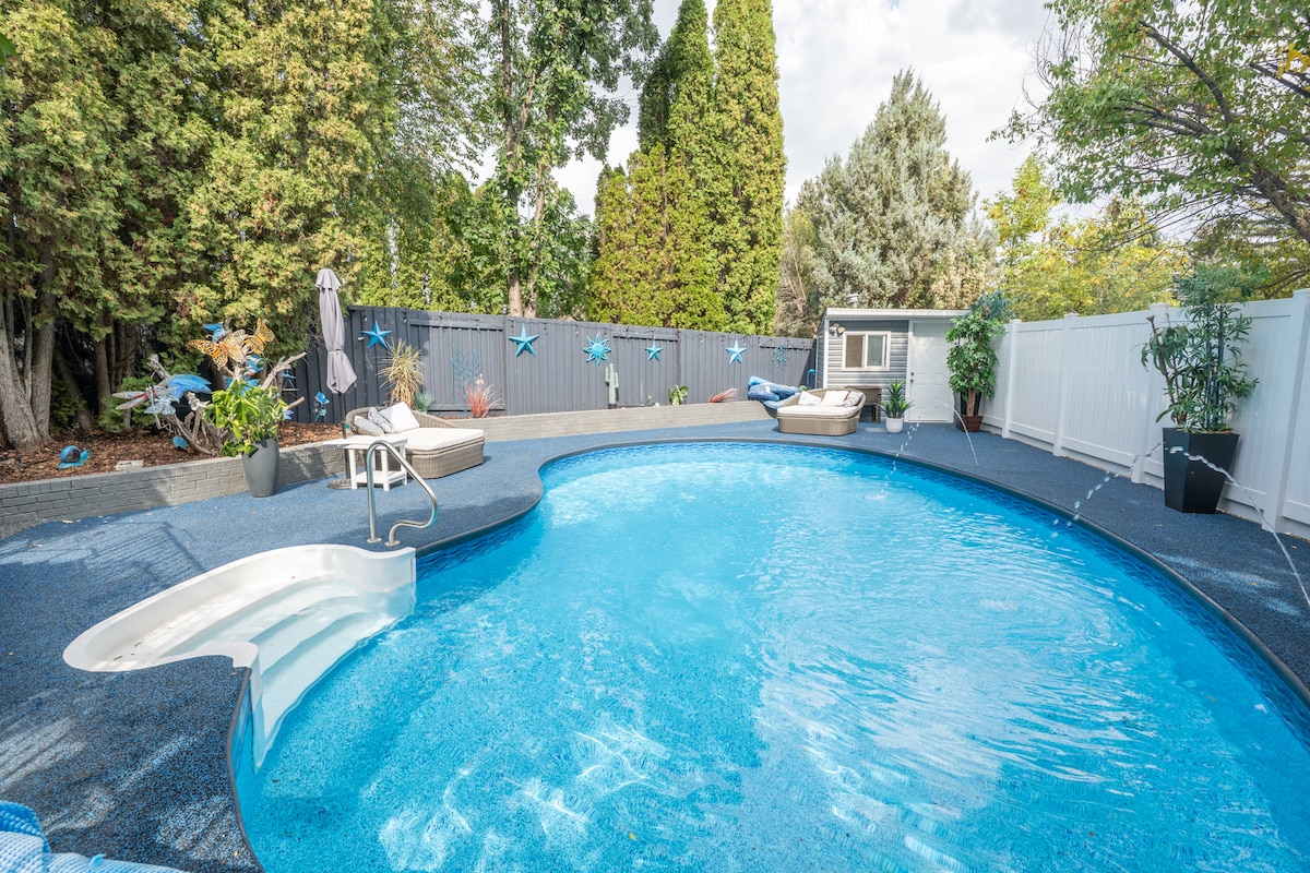This stunning executive home features an amazing outdoor Oasis. Heated outdoor pool, hot tub, outdoor kitchen and dining space. Inside you will find a stylish 5 level split home with an open concept kitchen, dining room and a theatre room in the basement. Centrally located this home has it all. Featuring 4 bedrooms with 1 king bed in Master, 1 queen bed upstairs, 1 queen bed on the 4th level, 1 single bed on the 4th level, 1 queen sofa bed on the 5th level.