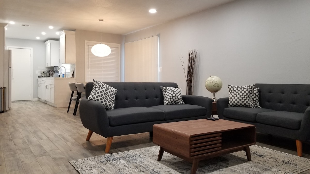 Esta es una casa dúplex de 2 dormitorios y un baño recién reformada. Con todos los muebles y electrodomésticos nuevos, decoraciones de buen gusto, un televisor de 72 pulgadas con barra de sonido y subwoofer, ¡es posible que no quieras irte! Estamos en una ubicación céntrica, a una manzana de restaurantes, hoteles y tiendas, es la ubicación perfecta para viajes de negocios o placer. Estamos a una manzana de la autopista 120/108, por lo que es conveniente, pero a la hora pico es probable que escuches algo de tráfico. Lavadora/secadora en el garaje. Por favor, deja tus zapatos en la puerta.