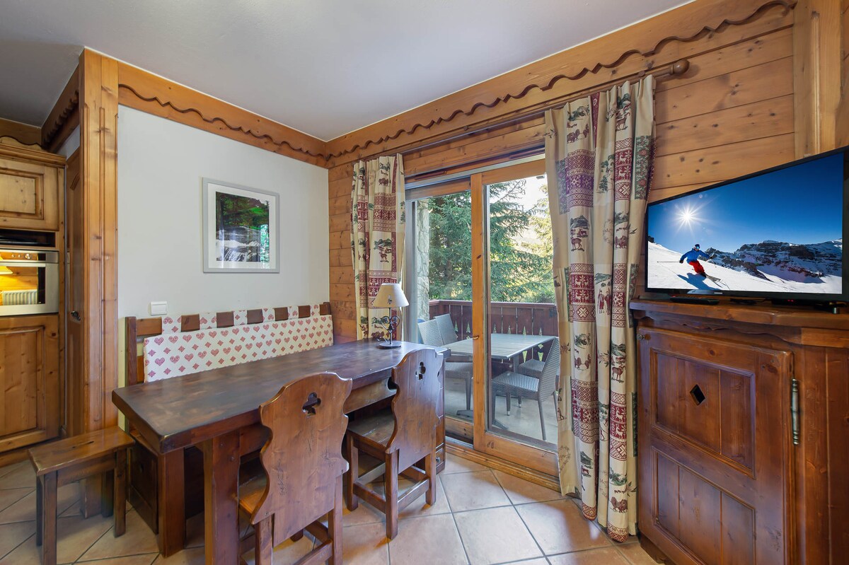 Apartamento clasificado 3*** y «Label Méribel». Excelente ubicación y muy buena exposición a 50 metros de las pistas (Plateau Rond-Point). Cerca de las tiendas, este apartamento de 2 habitaciones totalmente renovado incluye una cocina equipada (lavavajillas, microondas con grill, Nespresso, placas de inducción…), zona de comedor, sofá cama en la sala de estar. Dispone de un dormitorio con cama de matrimonio y cuarto de baño con ducha (lavadora). La decoración refinada le seducirá. Amplio balcón accesible desde el salón y el dormitorio. Aparcamiento.