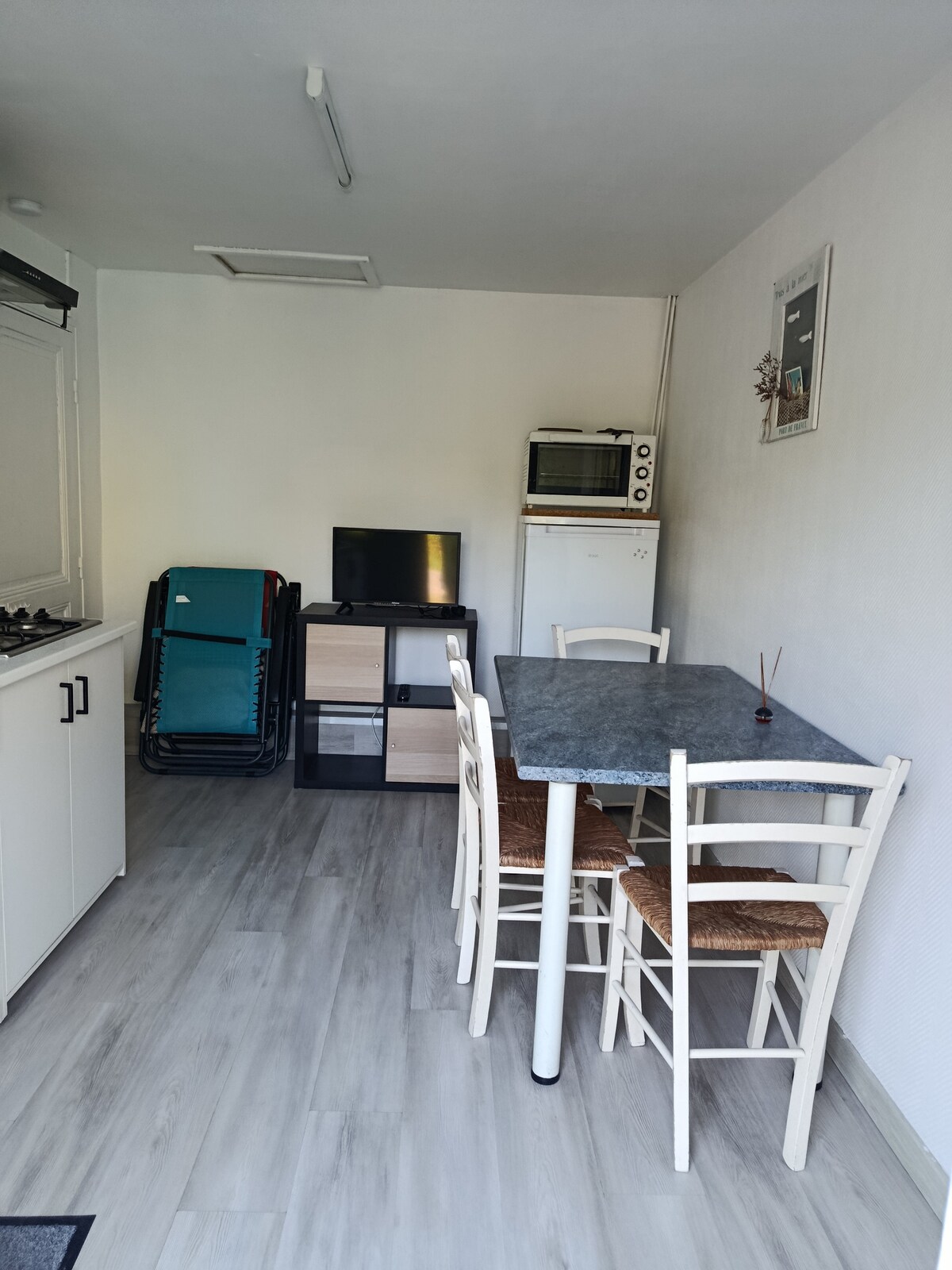 Habitación, cuarto de baño, aseo y pequeña zona de cocina. Independiente, cerca del centro de la ciudad, tiendas y mar (acceso a pie, a menos de 10 minutos). Lugar tranquilo, reformado y equipado. Carretera de fácil acceso para estacionar. Wifi gratis. Posibilidad de fumar fuera del alojamiento. El patio es común, con la casa de los propietarios. Llegadas y salidas libres (caja de llaves segura)