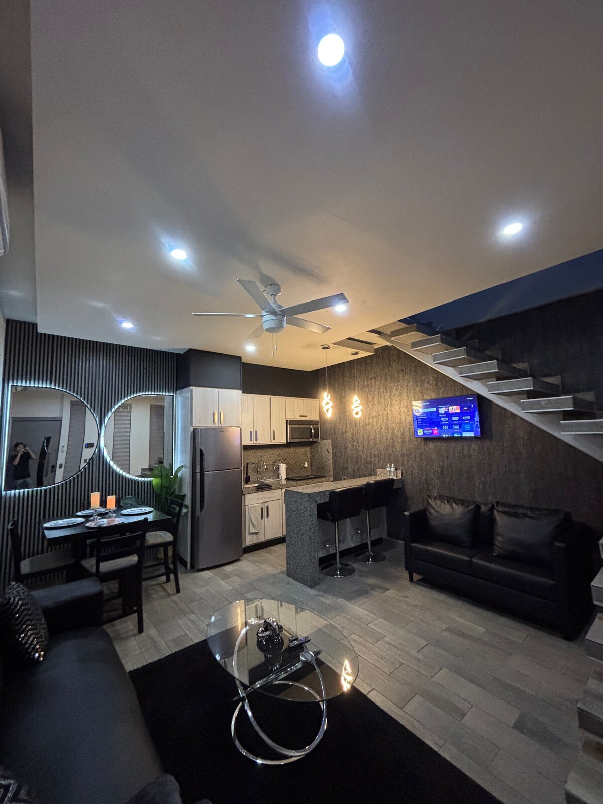 Departamento moderno en area segura ideal para estancias comodas ubicado a corta distancia caminando de bancos restaurantes gimnasio y zona hotelera perfecto para viajeros de negocio o descanso cuenta con espacios funcionales iluminacion agradable y ambiente tranquilo estacionamiento disponible sobre la acera cercano a todos los servicios necesarios para una experiencia practica accesible y confortable en la ciudad. Ubicado en segundo piso.