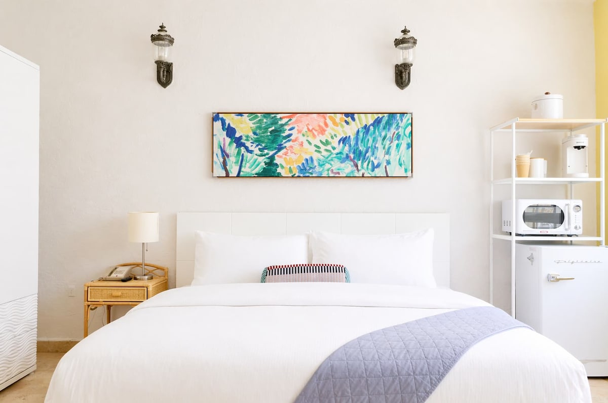 Hospédese en una luminosa y espaciosa suite Art Deco en el prestigioso vecindario South of Fifth de South Beach, a solo pasos del océano. Esta tranquila sección de Ocean Drive ofrece un escape sereno cerca de parques infantiles, áreas para perros y gimnasios al aire libre. Descubra la gastronomía de renombre, desde lugares locales casuales hasta restaurantes con estrellas Michelin, y disfrute de la vibrante vida nocturna a poca distancia. Esta luminosa esquina cuenta con cama king, comedor junto