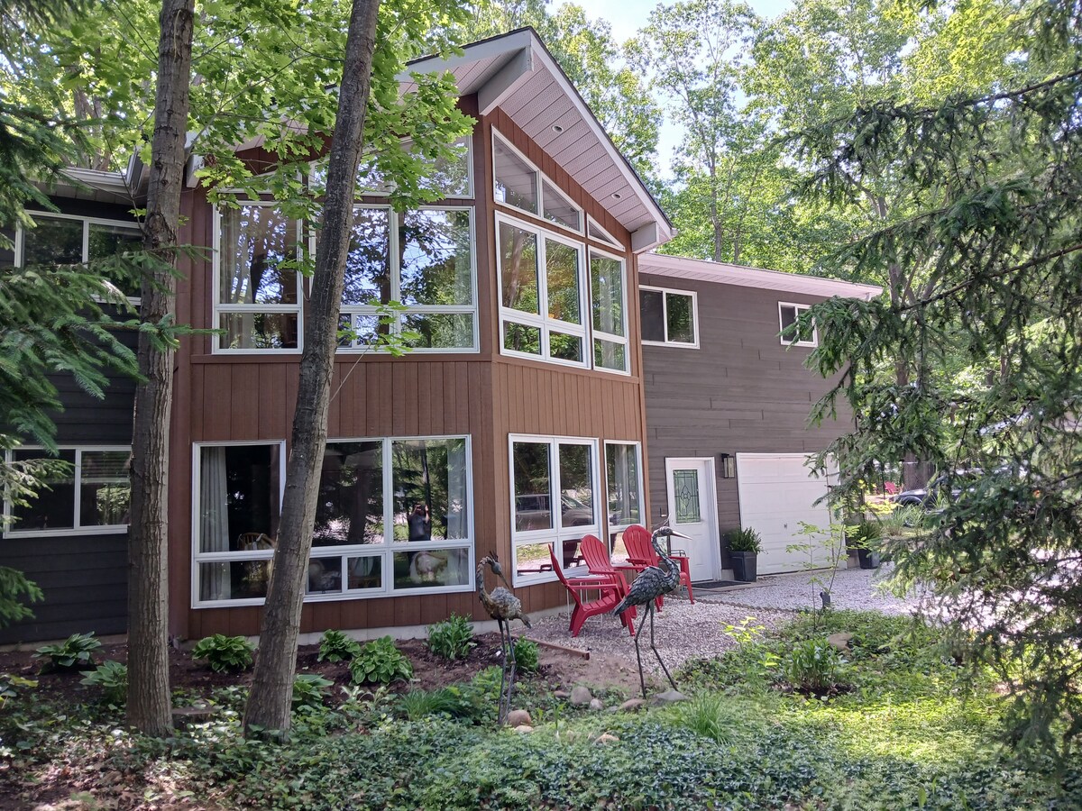 El paisaje panorámico es el telón de fondo de la serenidad en esta elegante casa; una vista pintoresca del lago, chimenea al aire libre, bosque encantador, pequeño estanque artificial y muchos avistamientos de ciervos. Cenador con mosquitero con mesa de comedor al aire libre y muchos asientos al aire libre, incluido un conjunto de salón. El interior cuenta con 2 dormitorios y un solárium con 2 sofás cama con vistas al lago. Bunkie terminado con baño completo disponible para más de 6 huéspedes. Se puede ir andando a Little Beach y a 7 minutos en coche de Big Beach. No hay acceso a la playa desde la propiedad.