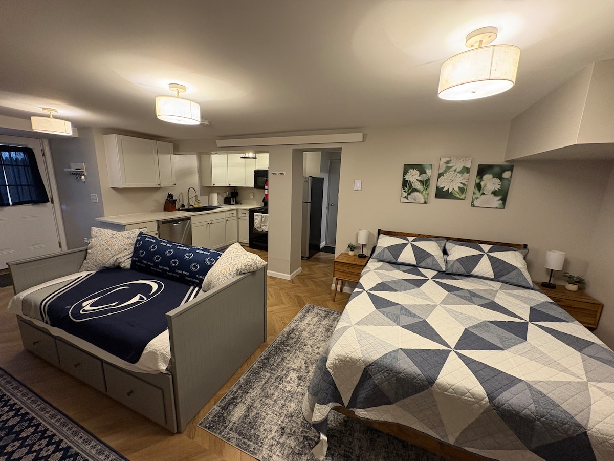 Bienvenido a Blue & White Studio, un refugio privado y cómodo con vistas panorámicas a Seven Mountains a pocos minutos de la Universidad Estatal de Pensilvania. El estudio ofrece una cama tamaño queen, una acogedora sala de estar, una cocina bien equipada y una entrada privada, todo diseñado para una estancia perfecta. Disfruta del tranquilo entorno de montaña mientras te mantienes cerca de la emoción del día del juego, los eventos del campus y los senderos locales. Perfecto para fines de semana de exalumnos, escapadas de parejas y amantes de la naturaleza que buscan una base tranquila y cómoda cerca de Penn State.