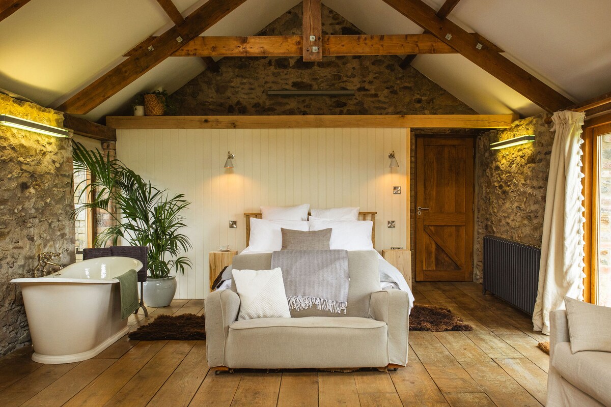 Un espacio tranquilo y profundamente lujoso para recargar energías y reconectar. The Shippon es un establo de vacas meticulosamente convertido con suelos de hormigón pulido y radiante, paredes de color verde oscuro suavemente curvadas, cocina hecha a mano, rincones de lectura cálidamente iluminados y materiales naturales. Mantas de lana, sofá de plumas, estufa de leña escandinava antigua, cama tamaño king con sábanas y edredón franceses, ducha de cascada y las toallas más suaves. Nuestra tranquila aldea de Devon solo está iluminada por las estrellas por la noche. Es posible que duermas mejor de lo que has dormido en años.