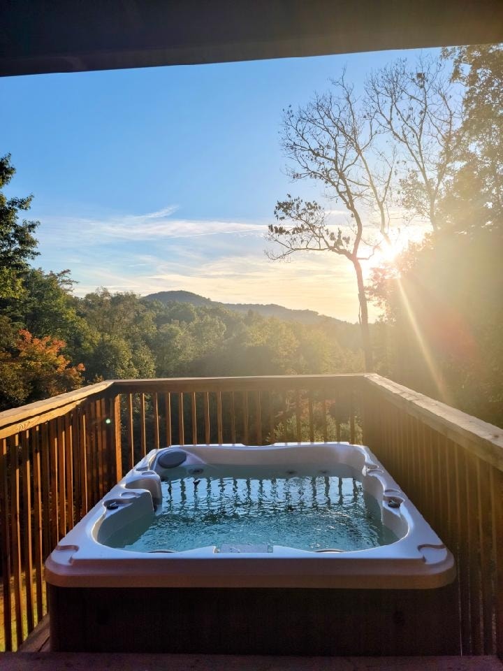 Cabaña con vista a la montaña con jacuzzi, sala de juegos y fogata. Suite King más 2 dormitorios queen, 3 baños completos, capacidad para 6 personas. La sala de juegos tiene juegos de arcade, tejo, mesa de juegos infinita con más de 100 juegos de mesa. Porche con mosquitero, wifi potente, televisores con streaming, cocina completa, lavadora/secadora, chimenea de gas. Apto para mascotas. A 15 minutos del centro de Blue Ridge, a 20 minutos del lago Blue Ridge. Acceso pavimentado durante todo el año. Limpieza profesional entre estancias. Reservación inmediata disponible. Superanfitrión de 5 estrellas con más de 200 reseñas.