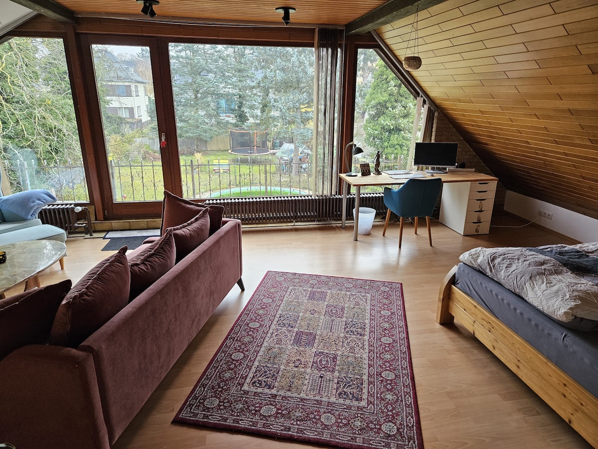Nuestro luminoso apartamento en la azotea con sus vigas de madera de 150 años se encuentra en medio de un barrio encantador. Cuenta con una cocina pequeña pero elegante y un baño de lujo, equipado con ducha de efecto lluvia y sauna finlandesa. Ofrecemos Netflix, TV por cable e internet de muy alta velocidad. Tu estancia con nosotros será neutra en carbono, ya que compensamos completamente nuestras emisiones. El apartamento tiene capacidad para hasta 3 adultos o 2 adultos con niños.