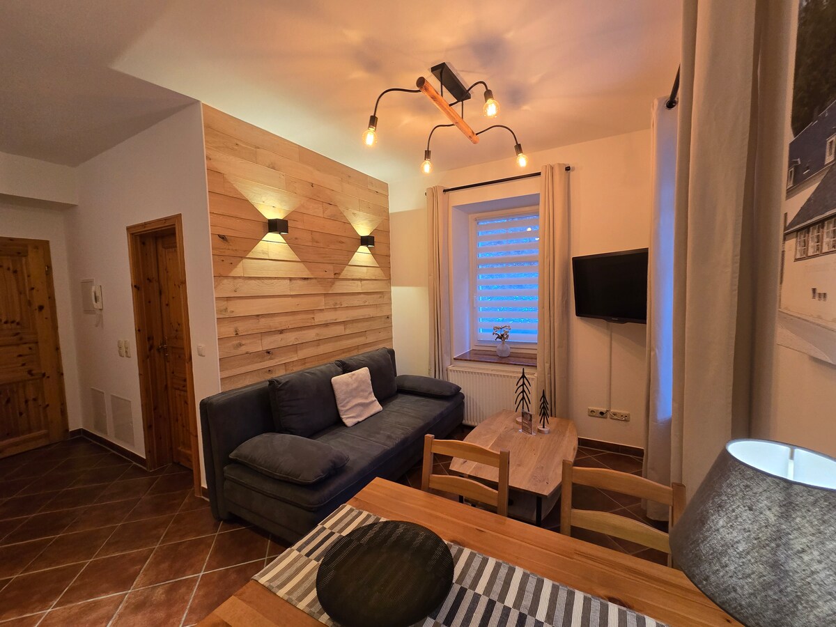 El apartamento "Hutzenzimmer" ofrece un salón y dos dormitorios suficiente espacio para relajarse por las noches después de un día activo. En casos especiales, el sofá de primavera se puede convertir en una opción para dormir. Uno de los dos dormitorios tiene una cama con un ancho de 120 cm.