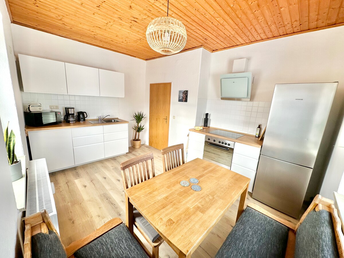 Ankommen und Wohlfühlen.... das ist unser Motto und Wunsch für Sie! Unsere Ferienwohnung liegt in der ersten Etage unseres Wohnhauses. Sie ist lichtdurchflutet und ermöglicht einen schönen Rundumblick in die nähere Umgebung. Sie besteht aus einer Schlafstube, mit Doppelbett und Schlafsofa, einer Wohnküche mit einem Ecksofa und einem geräumigen, modernen Badezimmer mit großer Dusche. Bei Bedarf kann ein zweites Schlafzimmer dazu gebucht werden.