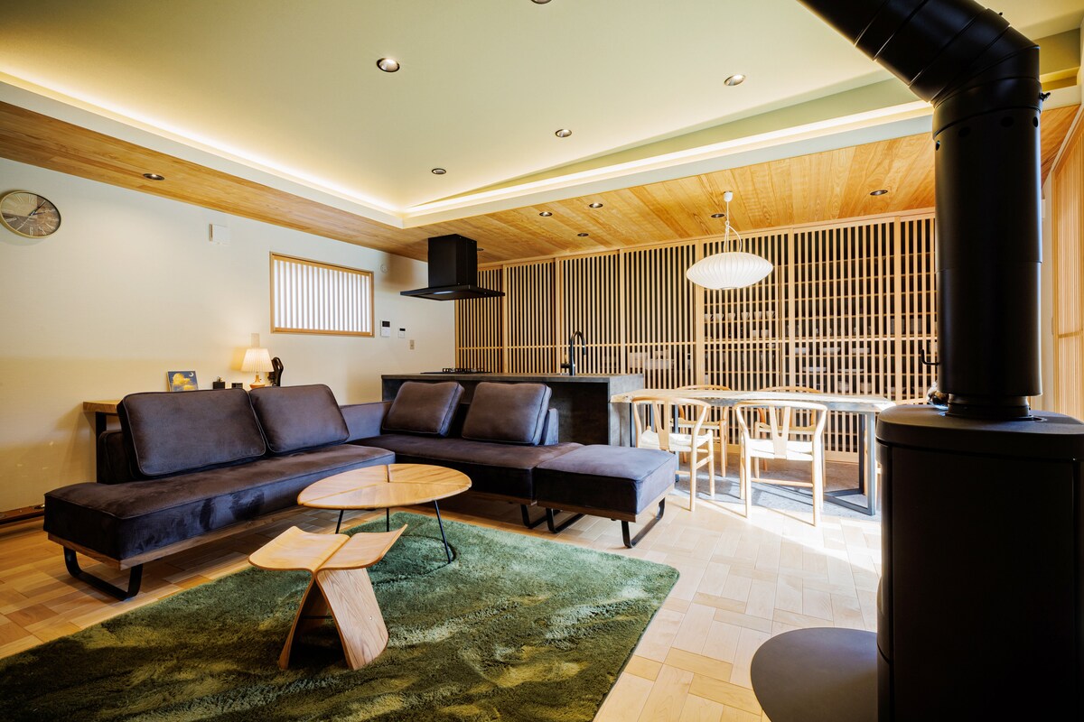Esta es una casa de campo nueva construida en 2022. Al entrar en la elegante casa con paredes exteriores negras, el pasillo de piedra que conduce a la sala de estar del techo alto te hará olvidar tu vida cotidiana. El baño al aire libre está rodeado de árboles y, en invierno, puedes disfrutar de un relajante baño con vistas a la nieve. Disfruta de un teatro privado en la sala de estar y el dormitorio con una pantalla de proyector de 100 pulgadas. Las pantallas y los escritorios también están disponibles para tu espacio de trabajo.