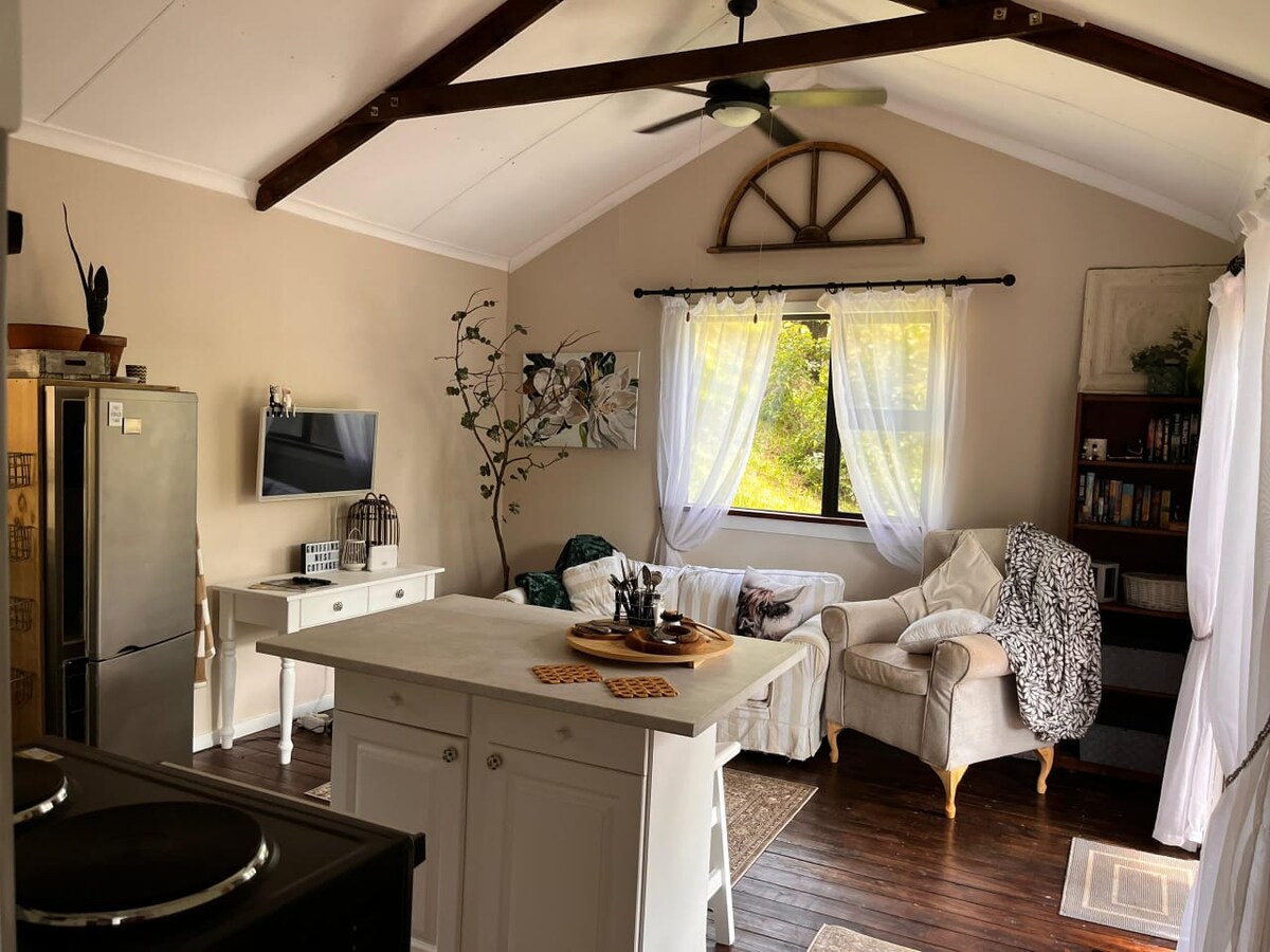 Nuestra acogedora cabaña con capacidad para 4 personas se encuentra bajo los árboles en nuestro hermoso jardín de permacultura. Está a pocos kilómetros en auto de centros comerciales, restaurantes, parques de juegos y rutas de senderismo. Está al lado de nuestra galería de arte y casa principal, pero con un jardín trasero para que te relajes. ¡También tenemos una piscina! Nos encantan los animales y esperamos que a ti también, ¡hay muchos gatos amigables y perros grandes alrededor junto con aves y monos! Los niños pueden traer su propia camiseta y serigrafiarla con nosotros de forma gratuita en nuestro taller.