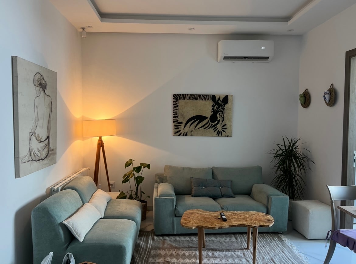 Situé dans un quartier récent, à proximité de toutes les commodités, cet appartement unique est un véritable hommage au savoir-faire des artisans locaux, qui ont tous contribué à sublimer cet espace. Dans une atmosphère chaleureuse et accueillante, vous aurez l’occasion de vivre pleinement l’authenticité et la richesse de la culture artistique tunisienne, incomparable en son genre. Chaque détail a été soigneusement pensé pour vous garantir une expérience de séjour inoubliable.