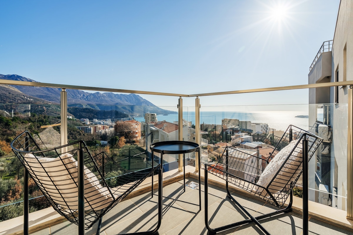 Escape to the hills above Budva in this luxury 1 bedroom apartment with panoramic views of the Adriatic, Old Town, and mountains. Enjoy exclusive access to a pool and private parking. Modern, fully equipped, and peaceful—ideal for couples or small groups up to four. Best for travelers with a car seeking quiet, comfort, and scenery just a short drive from Budva’s beaches and nightlife. Breathtaking sunsets from the balcony await!