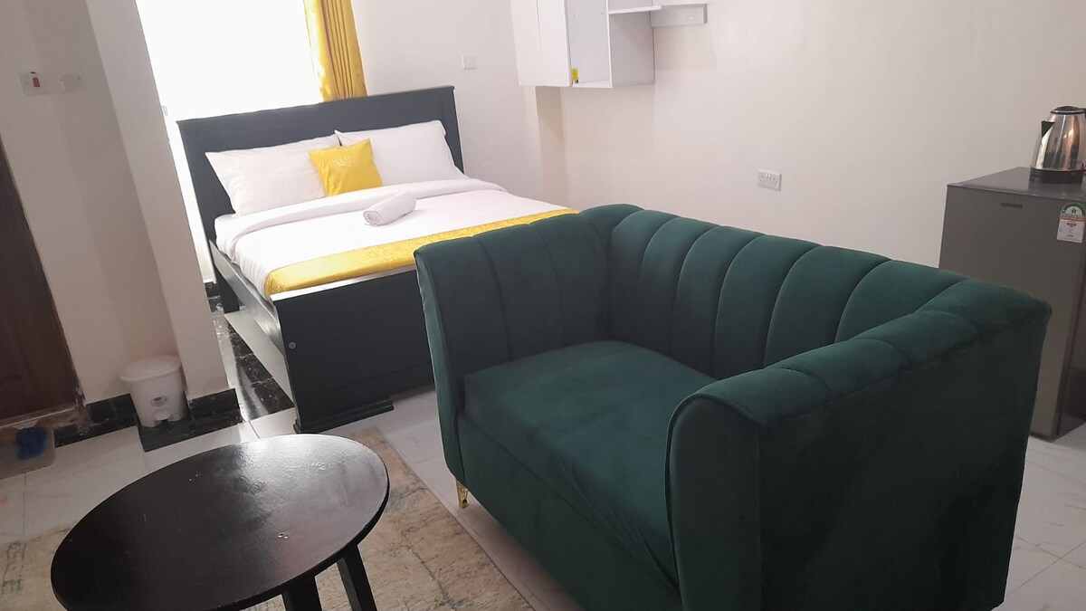 Suite moderna y exclusiva, completamente amueblada, limpia, espaciosa, tranquila, segura, apartamento de fácil acceso, situado en la ciudad de Kisii, finca nyanchwa junto a la escuela especial kisii. Disponible en todo momento. Tiene una televisión de 43 pulgadas, nevera, cocina, microondas, utensilios, horno, Internet de alta velocidad, 1 cama doble, un cómodo sofá, una casa hogareña que acomoda a personas en viajes de negocios, parejas, familias y vacaciones. También tiene un estacionamiento gratuito, a 500 m de la ciudad de Kisii. Comunícate por teléfono en todo momento.