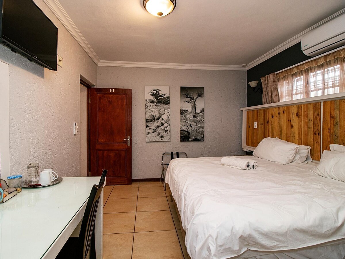 Cama doble, baño con ducha, DSTV, hervidor de agua, té, café, agua muerta 500 ml y un pequeño refrigerio; wifi gratuito. (Los niños menores de 10 años se quedan gratis, proporciona tu propio colchón y ropa de cama, máximo 2 niños gratis por habitación)