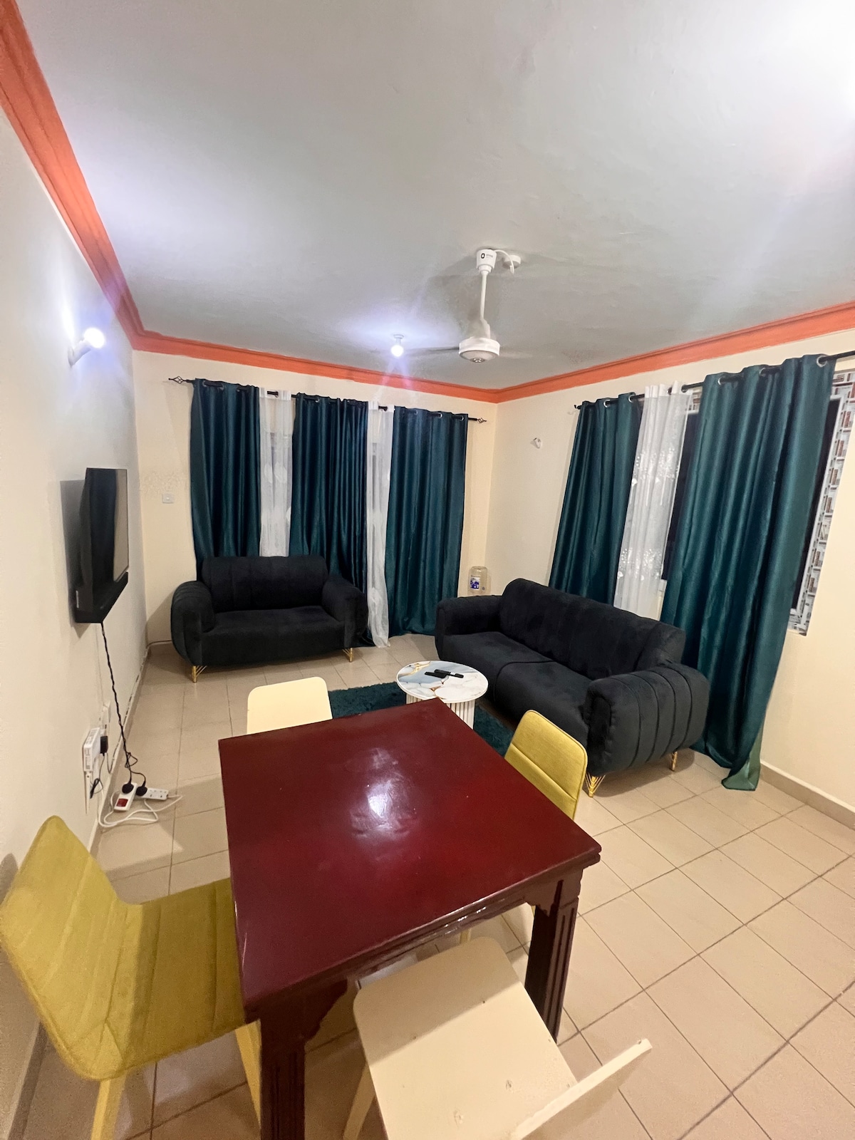 Acogedor apartamento estudio con servicios (Bamburi) amueblado. * Adecuado para 2 adultos y 1 niño o 3 adultos, amueblado con una cama tamaño queen y una cama individual. * Incluye aseo diario. * Mesa de comedor con cuatro sillas, sofá, mesa de centro. * Aire acondicionado *TV * Caja fuerte con llave * Balcón con dos sillas y mesa de centro * Cocina: nevera, microondas, hervidor de agua, cafetera, tostadora, vajilla y cubiertos. * Acceso a servicios: piscina, zona de juegos para niños, bar de playa, restaurante, gimnasio, playa, lavandería. * A 21 km del aeropuerto internacional de Moi. * A 26 km de SGR Mombasa.