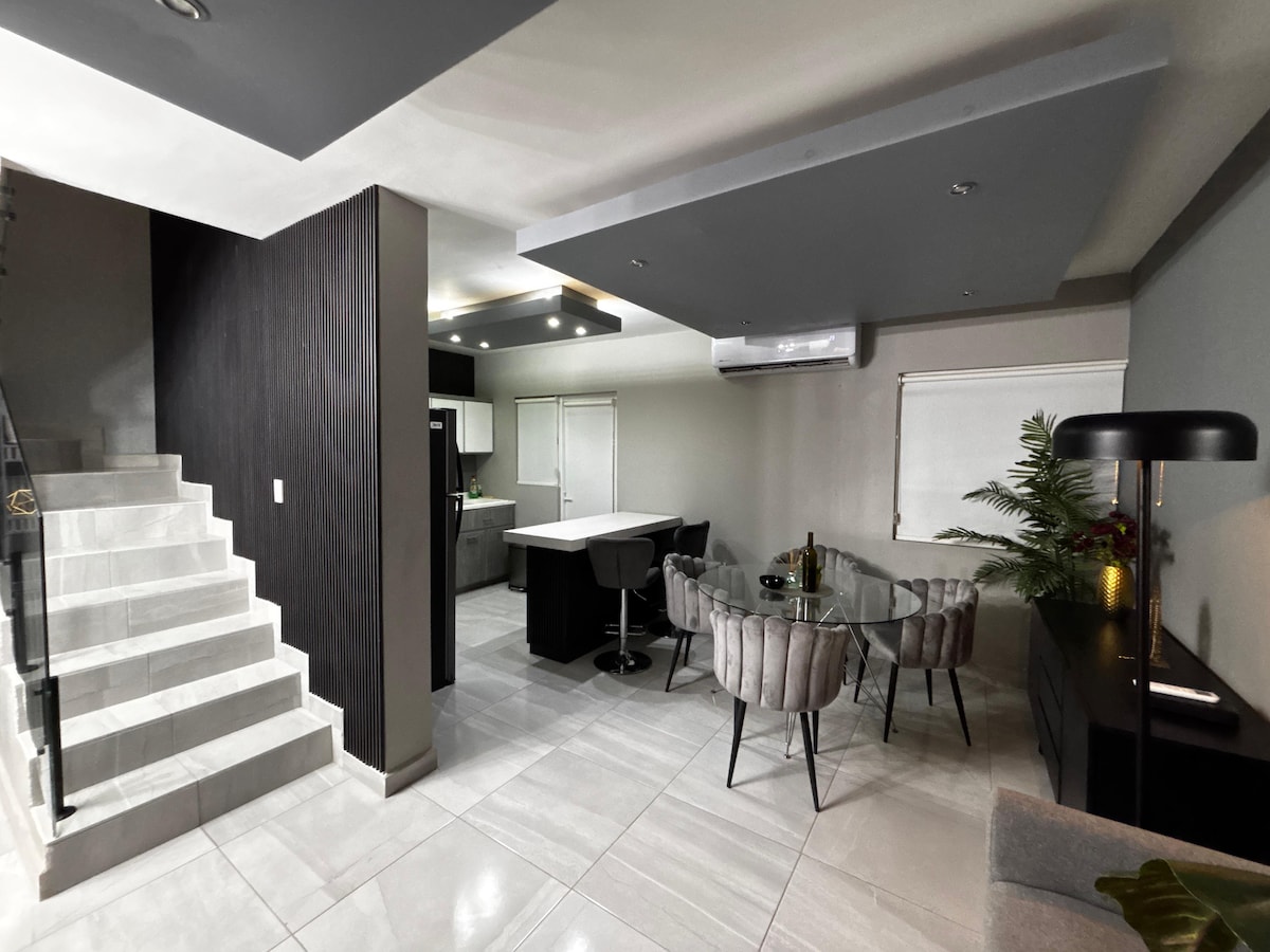 Este elegante alojamiento es ideal para 2 o 4 personas. Actualmentr tiene añadidas dos camas individuales.Estamos a 2 min del Mall Paseo MONCLOVA. Hay OXXO, Lavandería a 2 cuadras. También un patio independiente con portón, focos y mecedoras para pasar una noche al aire libre. Cuenta con agua caliente, hidro, minisplit, wifi Totalplay, y cocina básica. Cortinas blackout en la habitación. HAY AUN OTRO DEPARTAMENTO EN LA MISMA PROPIEDAD, ES PARA 6 PERSONAS PUEDE CONSULTARLO ANTES DE RESERVAR.
